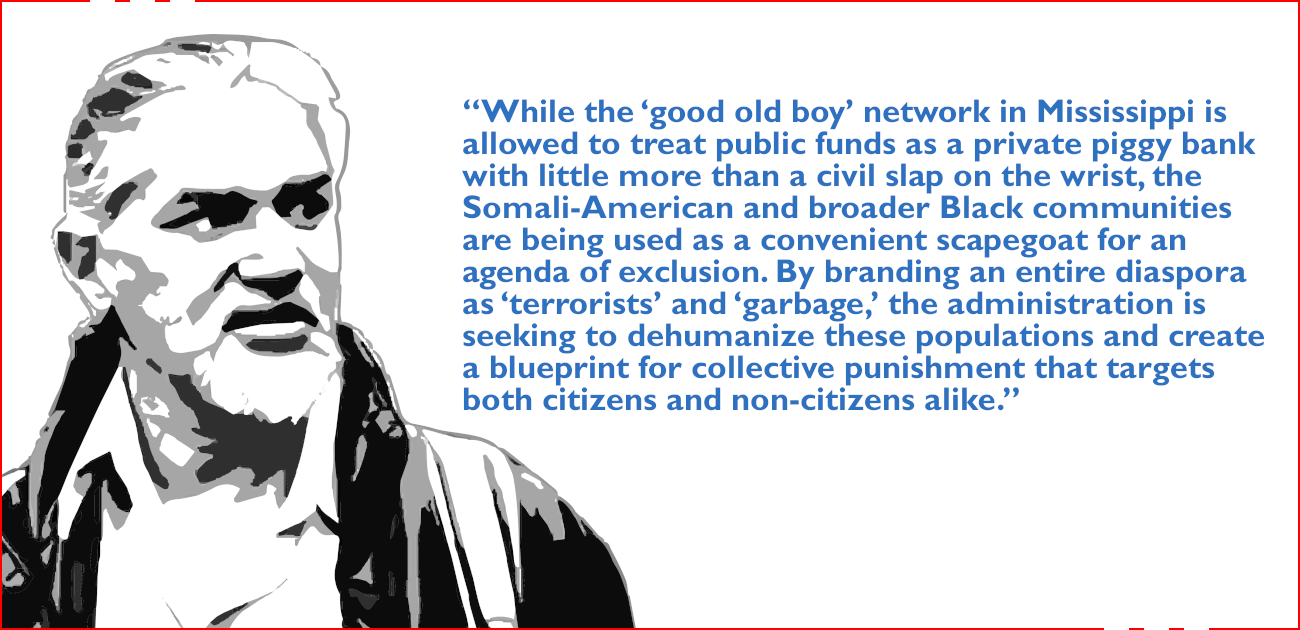 Ultimately, the divergence between the Mississippi and Minnesota scandals serves a singular political endgame: the systematic demonization of Black and Brown communities to justify the destruction of the social safety net and a return to an ethno-centric past. While the "good old boy" network in Mississippi is allowed to treat public funds as a private piggy bank with little more than a civil slap on the wrist, the Somali-American and broader Black communities are being used as a convenient scapegoat for an agenda of exclusion. By branding an entire diaspora as "terrorists" and "garbage," the administration is seeking to dehumanize these populations and create a blueprint for collective punishment that targets both citizens and non-citizens alike.